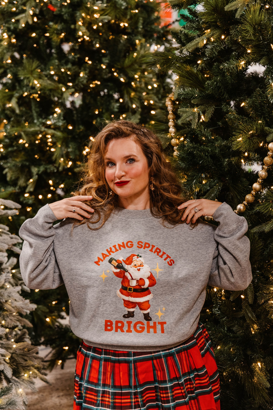 this sweatshirt celebrates all the spirits that make spirits bright.